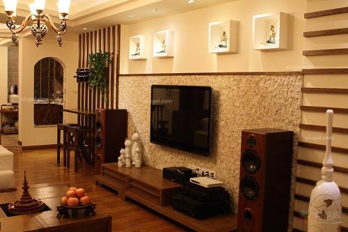 电视背景墙与客厅风格要一致,这是家装中最根本的准则。风格的一致能够让电视柜背景墙融入到整个客厅之中,让客厅看起来更调和、漂亮。