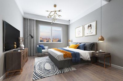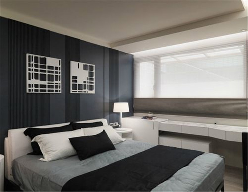 比较于主卧,在次卧的电视背景墙设计上运用了一些金属线条,与客厅的背景墙遥相呼应,使得空间更为现代时髦感。床头背景墙也是用装饰画装点,更为突出的是运用后现代风格的不规则画框,将高档感发挥的酣畅淋漓。